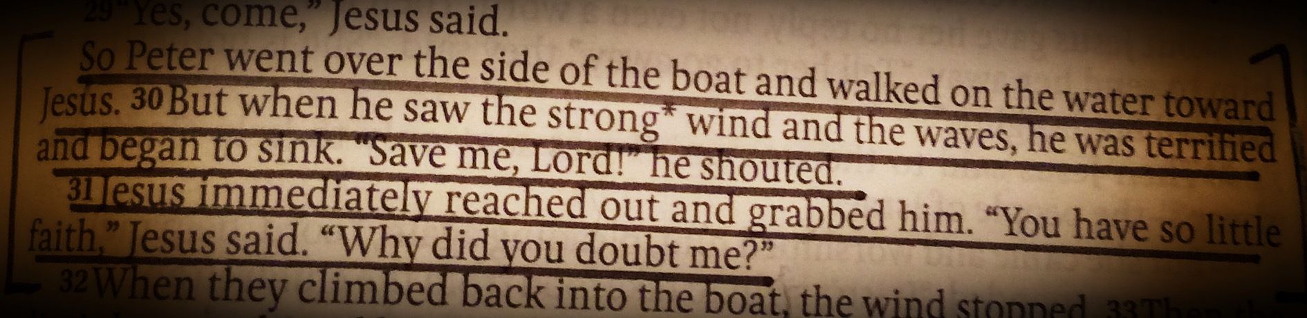I grabbed some a5 cartridge paper, which I strip painted and to each strip of colour added water droplets, flicks of paint, cling film or salt. Leaving this to dry, I turned to Matthew 14, which tells the story of Peter, who tried to walk across water to reach Jesus, but his faith waivered and he began to sink. Jesus lifts him to safety, and asks, ‘Why did you doubt me?’